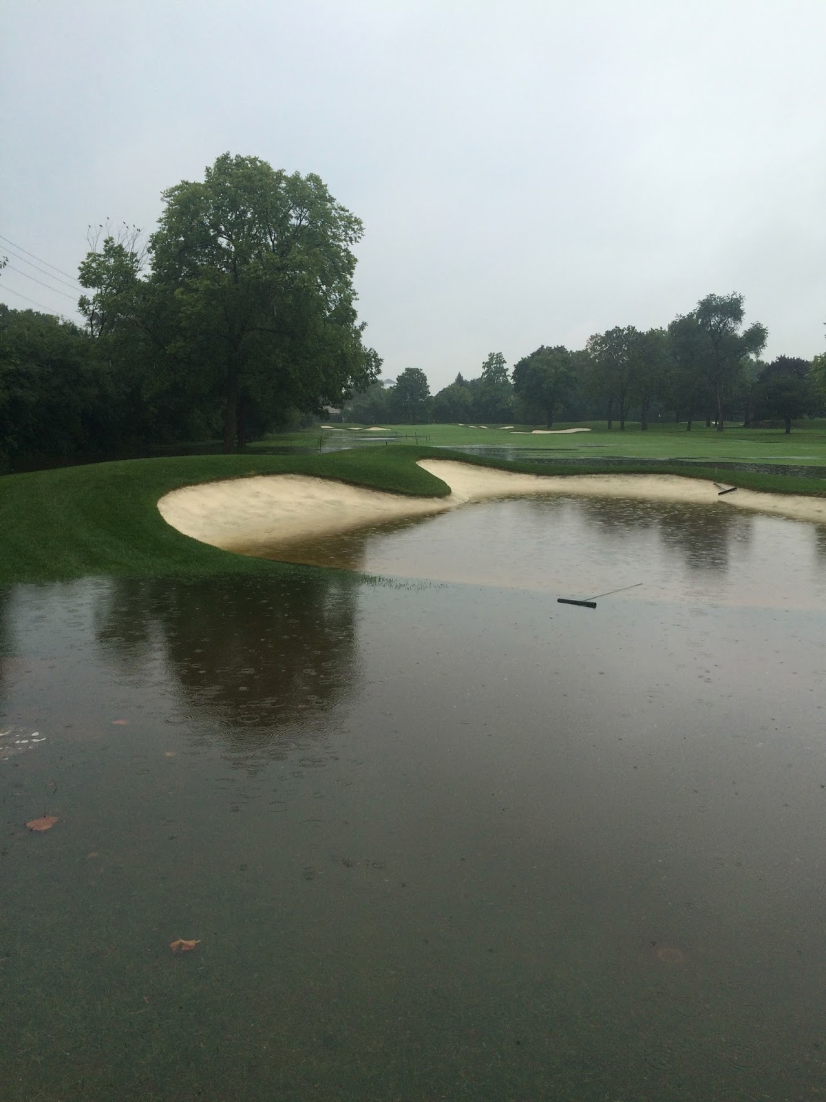 large greenside bunker at #14 green. The 6” clay tile traveling through the